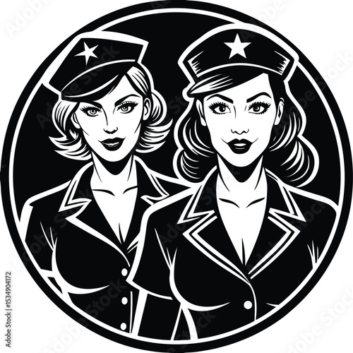 Retro Pin-Up Style Female Military Officers Black and White Illustration