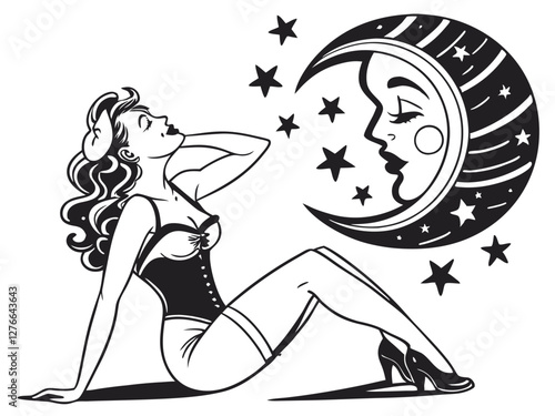 Retro pin-up style illustration, curvaceous woman in black swimsuit, sitting pose, crescent moon with face, stars, night sky, vintage comic book style, black and white linework, 1950s aesthetic,