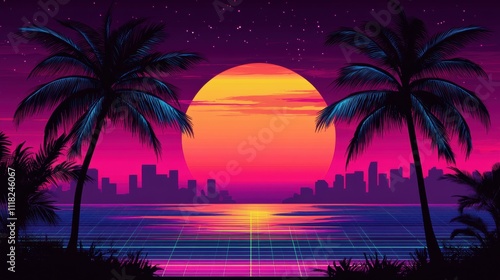 Retrofuturistic neon cityscape at sunset with palm trees