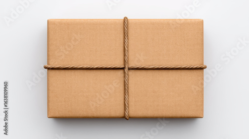 Return parcel, Parcel wrapped in brown paper with rope tied around it ready for return or delivery on white background