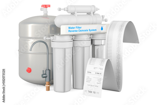 water, receipt, print, check, paper, bill, purification, drink, filter, appliance, concept, three-dimensional, illustration, background, white, isolated, domestic, household, kitchen, transaction, cheque, document, purchase, commerce, trade, sale, shop, shopping, store, payment, price, buy, business, cooking, equipment, service, protection, control, certified, security, safety, supply, technology
