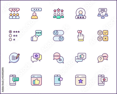 Review And feedback Icon Set. Vector collection of customer, rating, star rating, chat, testimonials, survey, support, communication, sign and element symbols or logo element.