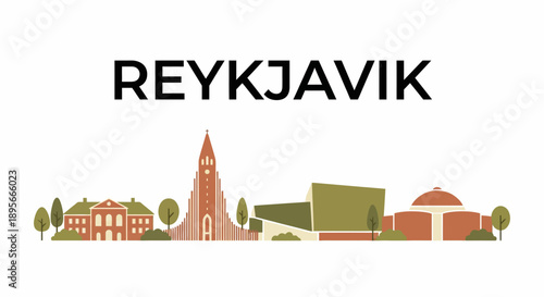 reykjavik, iceland, skyline, landmark, city, hallgrimskirkja, church, architecture, building, tree, house, capital, nordic, travel, tour tourism, vacation, destination, europa, scandinavia, culture, urban, horizontal, minimal, simple, journey, adventure, visit, vector, illustration, cartoon, drawing, graphic, design, isolated, white background, digital artwork, icon, clip art, stylised, earth-tone, modern, creative