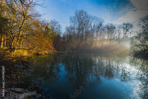 water, see, countryside, nature, flux, heaven, tree, autumn, blue, forest, duck pond, green, fall, cloud, beauty, spring, ecology, yellow, paint, season, park, fog, winter, rhine