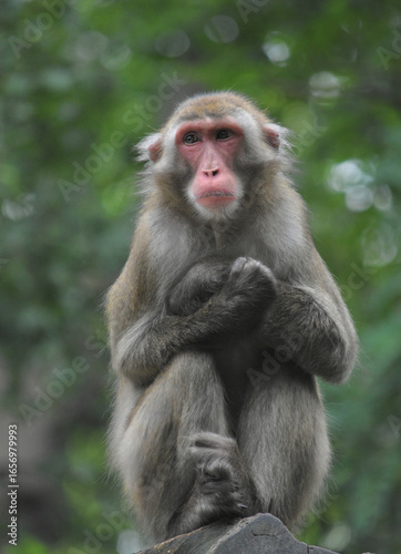 Rhesus macaque sitting on a rock in natural habitat