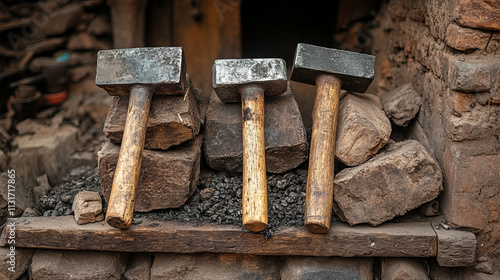 hammer, forge, tool, blacksmith, craftsmanship, metal, wood, stone, coal, workshop, industry, rustic, traditional, equipment, anvil, heavy, manual, trade, artisan, heritage, labor, fire, heat, blacksmithing, metalworking, historical, hand-made