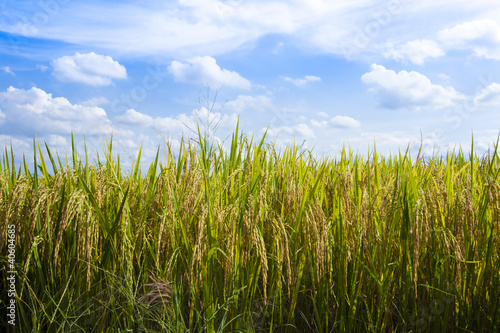 sky, cloud, white, rice, paddy, farm, sunlight, crop, grass, nature, autumn, blue, summer, background, green, shiny, scenic, outdoors, nobody, meadow, agriculture, growth, harvest, gold, ripe, harvesting, husk