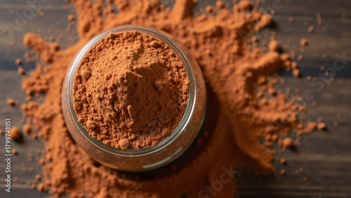 Rich cocoa powder in glass jar, surrounded by dusting of cocoa on wooden surface, evokes sense of warmth and indulgence