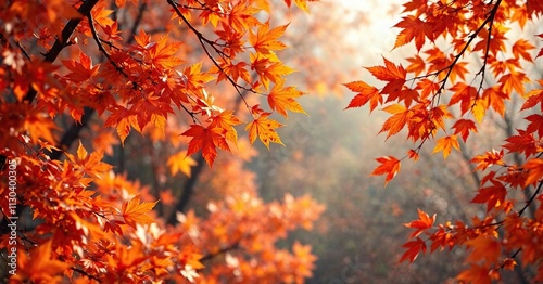 Rich orange hues blend with fiery reds as a kaleidoscope of autumn leaves rustle and sway, sun glare, fall foliage, vibrant colors