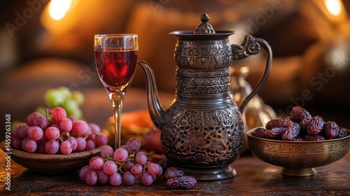 wine, grape, date, fruit, drink, beverage, tableware, metal, ornament, decoration, still life, vintage, rustic, home, interior, dining, luxury, tradition, culture, ethnic, design, pottery, pot, cup, glasses, food, delicious, tasty, healthy, fresh, organic, natural, sweet, dessert, cookery, eastern, middle eastern, arabic, festive, celebration, gathering, dining table, red wine, treat, hospitality, autumn, warm, evening, home decor