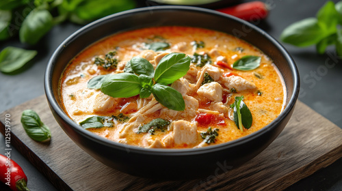 rich, soup, chicken, blend, healthy, spoon, meal, view, closeup, showing, receipe, herb, mix, dish, bowl, fresh, vegetable, food, delicious, lunch, dinner, cookery, cooking, spicey, tasty, meat, epicure, hot, blended, cream, creamy, background, homemade, eat, table, cooked, asian, boiled, asia