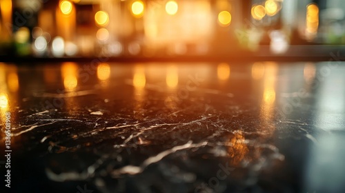Rich textured dark marble kitchen top, blurred background with vibrant kitchen decor, soft warm lighting, smooth focus shift