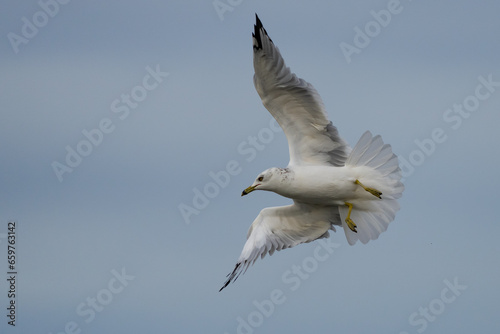 bird, gull, seagull, flying, landing, calling, peaceful, light background, blue, grey, nature, birding, no people