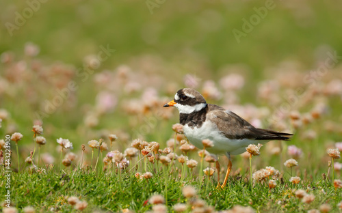 Ringed plover in pink thrift on a coastal area of Noss island, Scotland