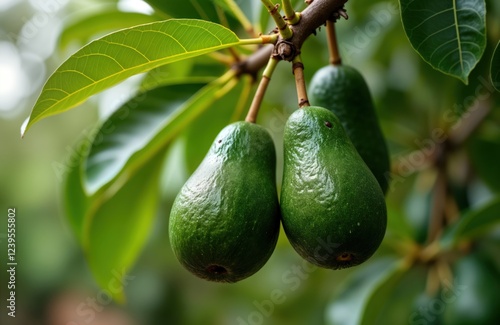 Ripe avocados hanging on avocado trees in a lush green plantation. Close-up view of fruits. Fresh healthy organic produce. Tropical farm. Harvesting time. Healthy food source.