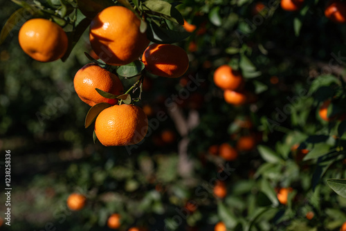 Ripe, delicious tangerine fruits on a branch in a tangerine orchard.