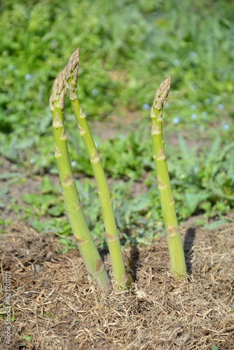 Ripe green asparagus in a garden bed. Three asparagus shoots ready for cutting - close-up of ripe vegetables in the garden.