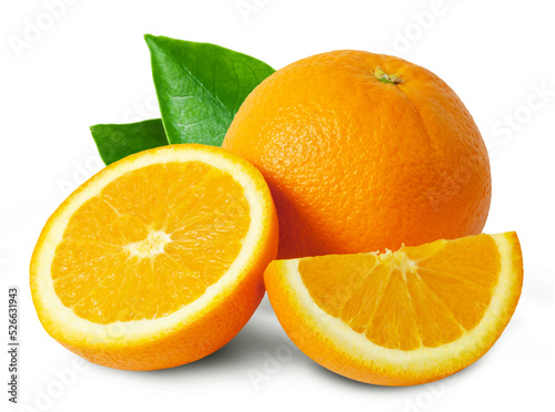 Ripe oranges have leaves and halves, split on a white background with clipping path.