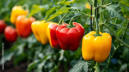 Ripe red and yellow bell peppers growing on plants in a garden