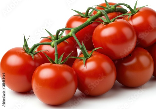 ripe tomatoes on the vine, bright red, glossy skin, green stems, cluster of tomatoes, fresh produce, high-resolution, photorealistic, white background, food photography, macro detail, vibrant colors,