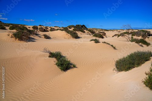 Ripples in the sand of the dunes of the Corralejo Natural Park in the north of Fuerteventura in the Canary Islands, Spain - Desert arid landscape with scattered shrubs in endless sand