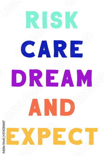 Risk, care, dream, and expect. Colorful isolated vector saying