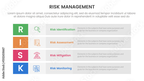 infographic, infographic, slide, presentation, template, text, list, point, point, layout, information, flat, graphic, step, stage, stage, icon, diagram, description, datum, analysis, banner, vector, 4, 4, risk, management, identification, assessment, monitoring, business, process, identifying, responding, potential, model, framework, strategy, company, organisation, decision, long, rectangle, box, boxed, round, background