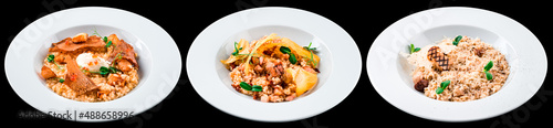 risotto collection set with mushrooms, parmesan cheese, pork meat and salmon isolated