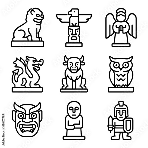 ritual, stone, icon, outline, icon, set, lion, totem, pole, guardian, angel, carved, dragon, mythical, beast, owl, mask, spirit, figure, ancient, warrior, line, only, black, colours, consistent