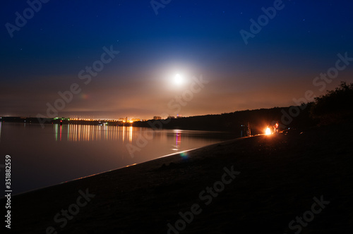 River Bank at night, fishermen on the Bank by the fire. Highlights from the city on the water