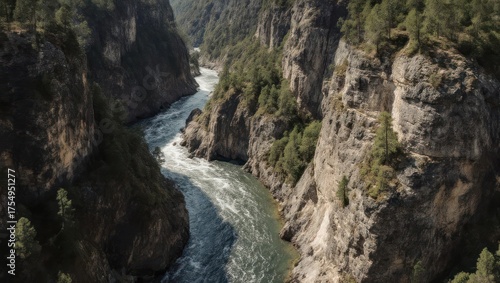 water, rapid, canyon, cliff, mountain, vale, nature, forest, tree, landscape, rock, stone, scenic, outdoors, flowing, erosion, adventure, travel, journey, view, wide, daylight, sun, light, shadow, depth, surface, turbulent, powerful, geology, formation, elevated, exploration, remote, wild, calmness, majesty, beauty, wilderness, perspective, horizon, background, greenery, texture, structure, dramatic, earth, huge, clear