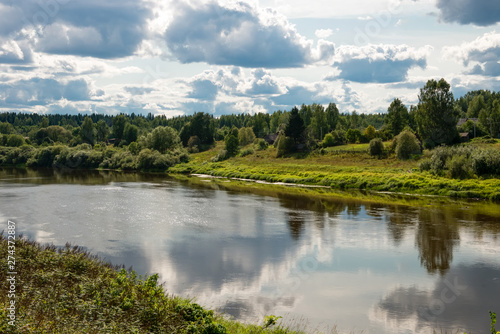 River landscape. River Msta and clouds reflected in the water on a summer day