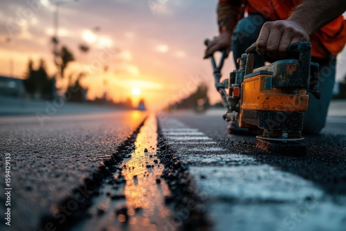 road, construction, sunrise, men at work, machinery, asphalt, highway, outdoors, morning, industrial, one person, city, paving, equipment, manual, labor, transport, surface, orange, safety, helmet, workwear, light, sun, dawn, roadway, urban, line, paint, sharpened, detail, infrastructure, engineering, development, process, hard, effort, resolve, blurry, horizon, transportation, renovation, travel, progress, scenery, design