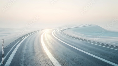 road, snow, landscape, white, light, horizon, winter, asphalt, line, driving, journey, distance, empty, serenity, huge, dreamy, misty, fog, cold, blue, grey, sun, bright, curve, direction, future, travel, adventure, open, path, way, highway, freedom, nature, hope, perspective, minimalism, abstract