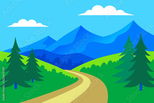 landscape, mountain, sky, nature, vector, summer, forest, tree, mountain, grass, illustration, green, snow, meadow, hill, view, cloud, cloud, blue, spring, scene, season, cartoon, field, river