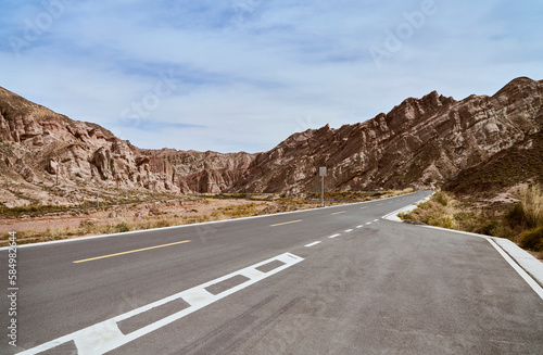 road, highway, desert, asphalt, sky, mountain, landscape, travel, nature, rock, park, red, mountain, horizon, empty, transportation, vale, line, route, china