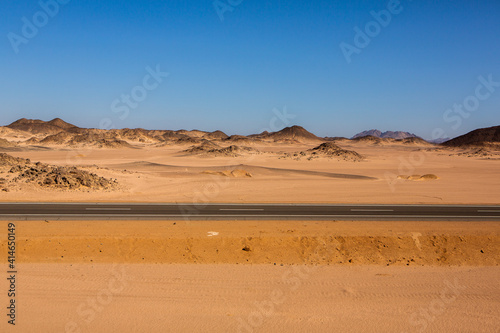 Road in the sahara desert of Egypt. Conceptual for freedom, enjoying the journey. Empty road. Freeway, Highway through the desert