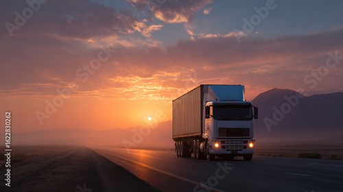 Road Journey Silhouette: A solitary semi-truck travels along an open highway against the backdrop of a mesmerizing sunset, symbolizing the endless journey and freedom.