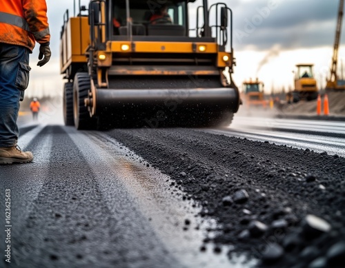 asphalt, paver, road, construction, machine, paving, surface, blacktop, highway, industry, transport, heavy, roller, bitumen, fresh, layer, daylight, equipment, infrastructure, street, civil, site, engineering, urban, gravel, roadway, vehicle, maintenance, machinery, worksite, tool, rebuild, slab, repair, build