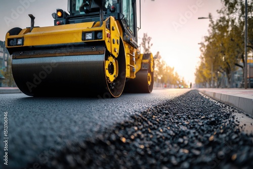 asphalt, construction, road construction, paving, heavy equipment, infrastructure, city street, sunset, yellow, black, roadwork, roller, machine, engineering, development, transportation, urban, industry, technology, site, building, surface, repair, maintenance, heavy machinery, driveway, pavement, road, street, urban setting, city, vehicle, equipment, industrial, daylight, outdoors, work, progress, civil engineering