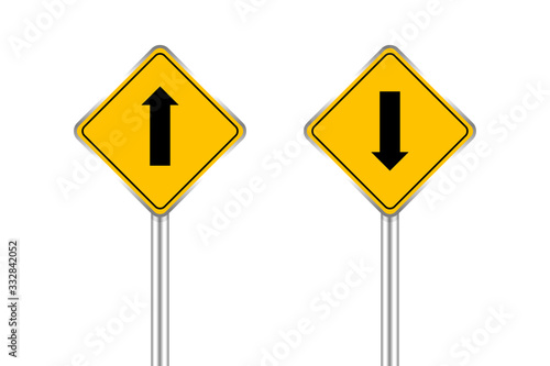 road sign black arrow pointing up and down, traffic road sign yellow isolated on white, yellow traffic sign ahead and down, warning caution sign and steel pole for direction signpost the way