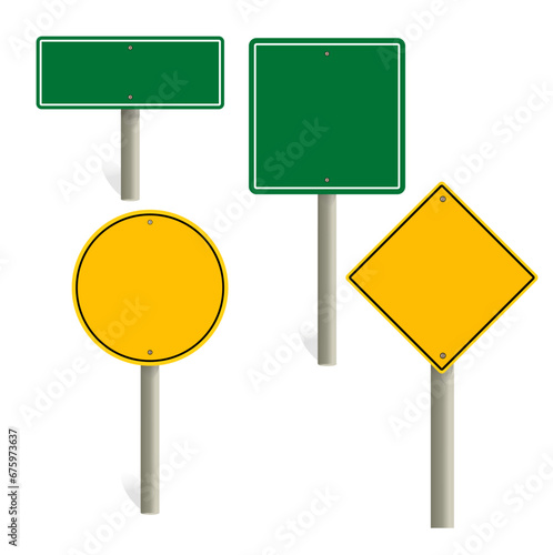 road sign blank template. Road sign set traffic blank sign mockup blank. Highway signs. yellow pointers on the road, traffic control signs, and road direction signboards. Vector illustration