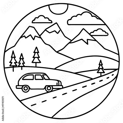 road, trip, outline, colouring, book, page, line, art, drawing, vector, illustration, vignetting, design, black, white, travel, journey, adventure, vehicle, car, highway, scenery, map, route, explore, vacation, tour, landscape, holiday, roadmap, destination, scenic, hand-drawn, creative, editable, print, children, adult, fun, activity, education, excursion, path, exploration