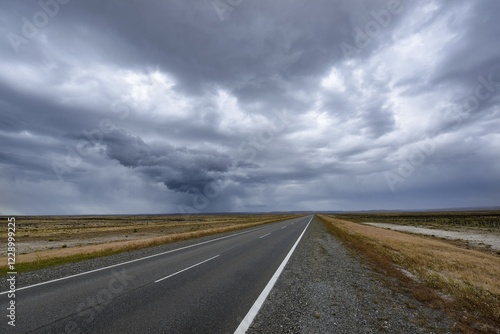Road with thunderstorm mood by the pampa of Patagonia, near Rio Gallegos, Argentina, South America