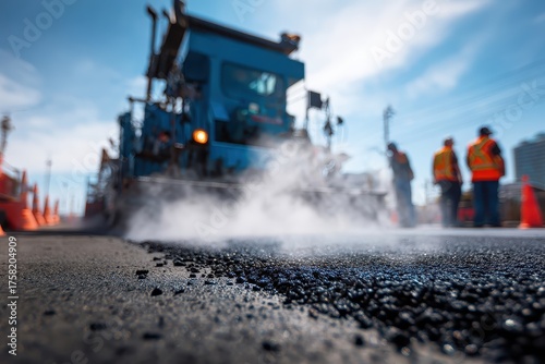 Roadwork crew lay new asphalt with heavy machinery on city street. Great for illustrating infrastructure projects, construction, and city planning.