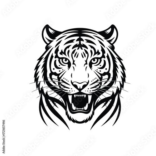 Roaring Tiger Head Illustration in Black and White for Logo, Tattoo, and Mascot Design