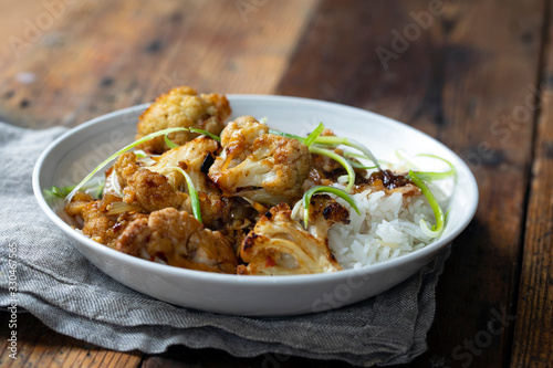 cauliflower, food, vegan, vegetarian, vegetable, meal, dish, rice, sauce, spicey, cookery, bowl, diet, onion, floret, roast, dinner
