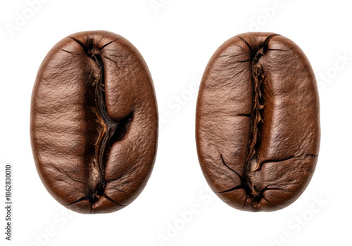 Roasted Arabica and Robusta coffee beans, dark brown, finely textured, side by side on seamless transparent background with copy space, top-down macro, UHD, concept of coffee bean variety comparison