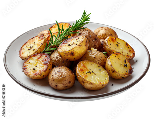 Roasted baby potatoes with rosemary on plate isolated on transparent background