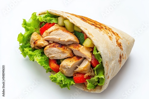 Roasted chicken and veggie pita with sauce Overhead shot on white